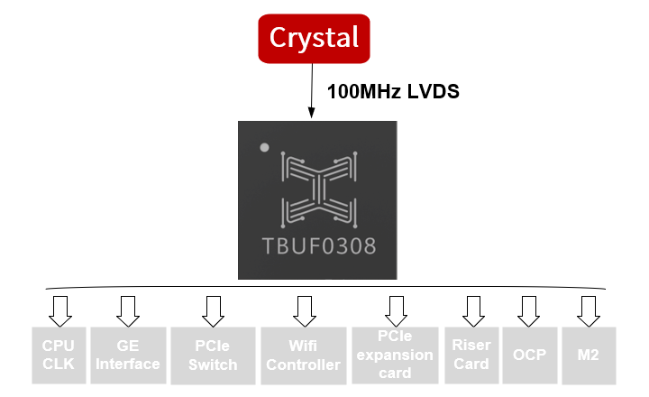 | TBUF0208 | 2.5V/3.3V | crystal/single-ended/differential | LVCMOS | 200MHz | <50fs | 8 | -40℃~85℃ | QFN32 |